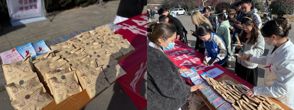 活动前期,医疗服务中心结合高校学生群体特点与学校艺术特色,制定了兼具专业性与趣味性的活动方案。校园内,医疗服务中心医务人员与学生志愿者为过往师生发放防艾科普手册和防艾伴手礼,手册中不仅包含权威医学知识,还配有防艾主题插画,让科学宣传更具亲和力。